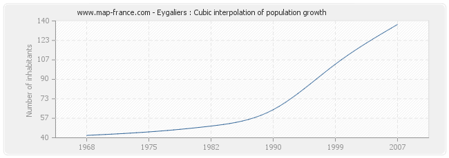 This curve shows the history of the population of Eygaliers from 1968 to 2007 in cubic interpolation. This provides more precisely the population of the municipality of Eygaliers the years where no census has been taken.