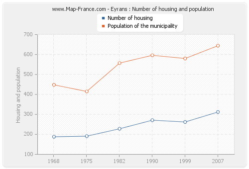 The population of Eyrans was 644 inhabitants in 2007, 580 inhabitants in 1999, 596 inhabitants in 1990, 557 inhabitants in 1982, 415 inhabitants in 1975 and 448 inhabitants in 1968. Meanwhile, the number of housing of Eyrans was 312 in 2007, 262 in 1999, 271 in 1990, 228 in 1982, 191 in 1975 and 188 in 1968.
