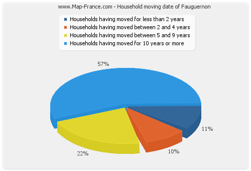 - Number of households of Fauguernon having moved between 2 and 5 years : 9 - Number of households of Fauguernon having moved between 5 and 9 years : 21 - Number of households of Fauguernon having moved for 10 years or more : 54 |