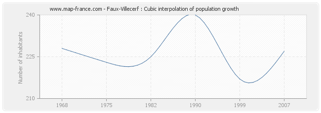 This curve shows the history of the population of Faux-Villecerf from 1968 to 2007 in cubic interpolation. This provides more precisely the population of the municipality of Faux-Villecerf the years where no census has been taken.