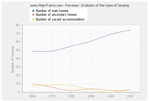 The number of housing of Favresse was 79 in 2007, 71 in 1999, 68 in 1990, 65 in 1982, 64 in 1975 and 66 in 1968.