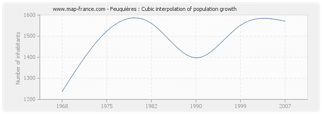 This curve shows the history of the population of Feuquières from 1968 to 2007 in cubic interpolation. This provides more precisely the population of the municipality of Feuquières the years where no census has been taken.