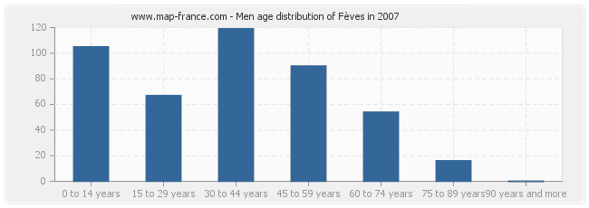Men population distribution of Fèves by age in 2007 :
