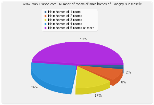 - Number of main homes of Flavigny-sur-Moselle of 1 room : 11 - Number of main homes of Flavigny-sur-Moselle of 2 rooms : 54 - Number of main homes of Flavigny-sur-Moselle of 3 rooms : 91 - Number of main homes of Flavigny-sur-Moselle of 4 rooms : 91 - Number of main homes of Flavigny-sur-Moselle of 5 rooms and more : 313 |