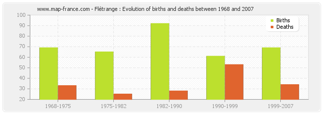 Flétrange : evolution of births and deaths from 1968 to 2007