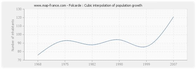 Population of Folcarde was 121 inhabitants in 2007, 86 inhabitants in 1999, 94 inhabitants in 1990, 88 inhabitants in 1982, 93 inhabitants in 1975 and 76 inhabitants in 1968.