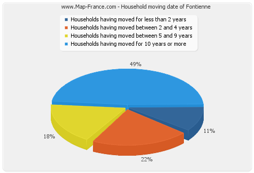 - Number of households of Fontienne having moved between 2 and 5 years : 12 - Number of households of Fontienne having moved between 5 and 9 years : 10 - Number of households of Fontienne having moved for 10 years or more : 27 |