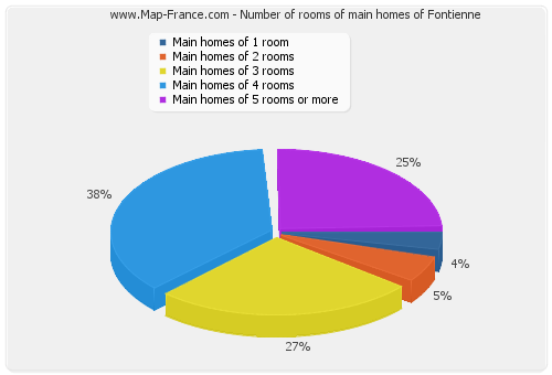 - Number of main homes of Fontienne of 1 room : 2 - Number of main homes of Fontienne of 2 rooms : 3 - Number of main homes of Fontienne of 3 rooms : 15 - Number of main homes of Fontienne of 4 rooms : 15 - Number of main homes of Fontienne of 5 rooms and more : 14 |