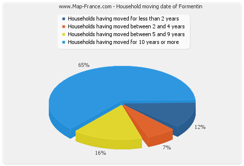- Number of households of Formentin having moved between 2 and 5 years : 5 - Number of households of Formentin having moved between 5 and 9 years : 12 - Number of households of Formentin having moved for 10 years or more : 48 |