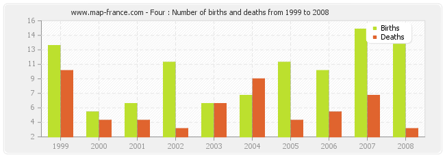 Population of Four was 980 inhabitants in 2007, 912 inhabitants in 1999, 733 inhabitants in 1990, 655 inhabitants in 1982, 556 inhabitants in 1975 and 565 inhabitants in 1968.