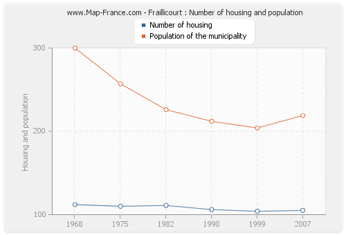 The population of Fraillicourt was 219 inhabitants in 2007, 204 inhabitants in 1999, 212 inhabitants in 1990, 226 inhabitants in 1982, 257 inhabitants in 1975 and 300 inhabitants in 1968. Meanwhile, the number of housing of Fraillicourt was 105 in 2007, 104 in 1999, 106 in 1990, 111 in 1982, 110 in 1975 and 112 in 1968.