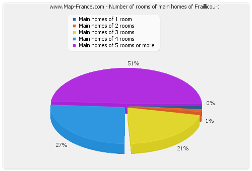 - Number of main homes of Fraillicourt of 1 room : 0 - Number of main homes of Fraillicourt of 2 rooms : 1 - Number of main homes of Fraillicourt of 3 rooms : 19 - Number of main homes of Fraillicourt of 4 rooms : 19 - Number of main homes of Fraillicourt of 5 rooms and more : 45 |