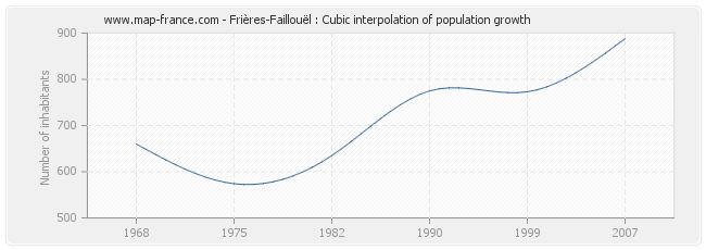 This curve shows the history of the population of Frières-Faillouël from 1968 to 2007 in cubic interpolation. This provides more precisely the population of the municipality of Frières-Faillouël the years where no census has been taken.