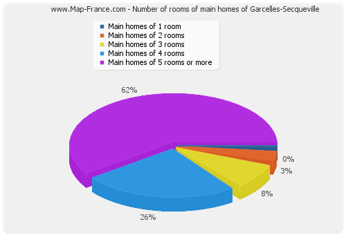 - Number of main homes of Garcelles-Secqueville of 1 room : 1 - Number of main homes of Garcelles-Secqueville of 2 rooms : 8 - Number of main homes of Garcelles-Secqueville of 3 rooms : 21 - Number of main homes of Garcelles-Secqueville of 4 rooms : 21 - Number of main homes of Garcelles-Secqueville of 5 rooms and more : 157 |