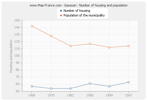 The population of Gaussan was 114 inhabitants in 2007, 112 inhabitants in 1999, 117 inhabitants in 1990, 114 inhabitants in 1982, 128 inhabitants in 1975 and 142 inhabitants in 1968. Meanwhile, the number of housing of Gaussan was 63 in 2007, 57 in 1999, 61 in 1990, 54 in 1982, 54 in 1975 and 57 in 1968.