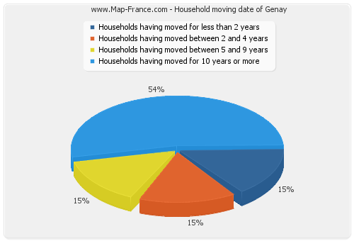 - Number of households of Genay having moved between 2 and 5 years : 24 - Number of households of Genay having moved between 5 and 9 years : 23 - Number of households of Genay having moved for 10 years or more : 84 |