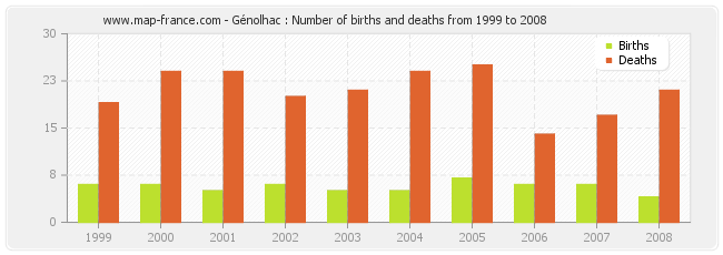 Génolhac : evolution of births and deaths from 1968 to 2007