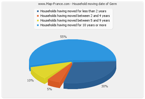 - Number of households of Germ having moved between 2 and 5 years : 1 - Number of households of Germ having moved between 5 and 9 years : 2 - Number of households of Germ having moved for 10 years or more : 11 |