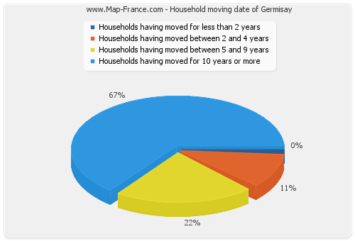 - Number of households of Germisay having moved between 2 and 5 years : 1 - Number of households of Germisay having moved between 5 and 9 years : 2 - Number of households of Germisay having moved for 10 years or more : 6 |