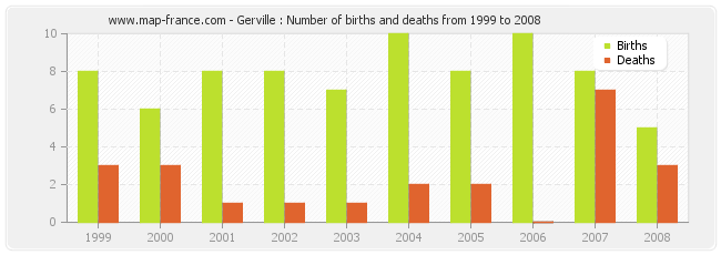 Population of Gerville was 413 inhabitants in 2007, 381 inhabitants in 1999, 351 inhabitants in 1990, 250 inhabitants in 1982, 235 inhabitants in 1975 and 272 inhabitants in 1968.