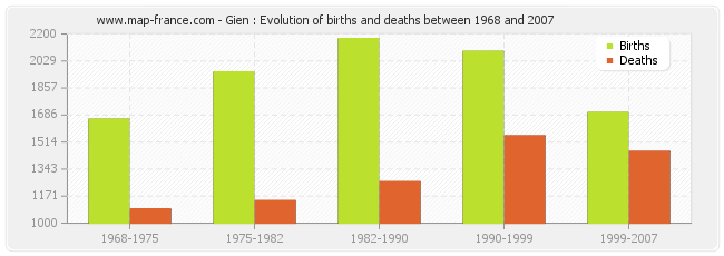 Population of Gien was 15 442 inhabitants in 2007, 15 321 inhabitants in 1999, 16 477 inhabitants in 1990, 16 064 inhabitants in 1982, 14 621 inhabitants in 1975 and 12 264 inhabitants in 1968.