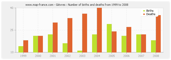 Population of Gièvres was 2 189 inhabitants in 2007, 2 027 inhabitants in 1999, 1 767 inhabitants in 1990, 1 666 inhabitants in 1982, 1 534 inhabitants in 1975 and 1 254 inhabitants in 1968.