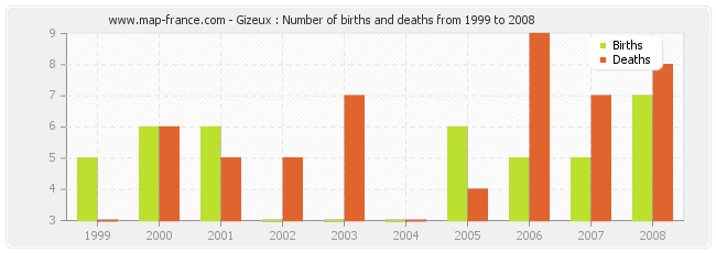 Gizeux : evolution of births and deaths from 1968 to 2007
