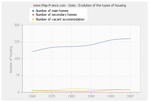 The number of housing of Goès was 261 in 2007, 256 in 1999, 230 in 1990, 225 in 1982, 215 in 1975 and 198 in 1968.