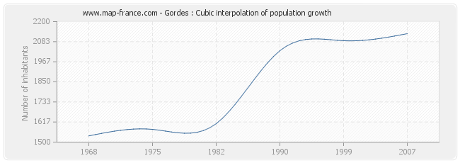 This curve shows the history of the population of Gordes from 1968 to 2007 in cubic interpolation. This provides more precisely the population of the municipality of Gordes the years where no census has been taken.
