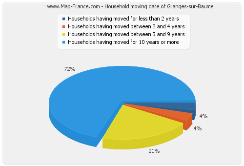 - Number of households of Granges-sur-Baume having moved between 2 and 5 years : 2 - Number of households of Granges-sur-Baume having moved between 5 and 9 years : 12 - Number of households of Granges-sur-Baume having moved for 10 years or more : 41 |