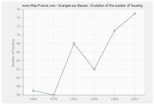 The number of housing of Granges-sur-Baume was 75 in 2007, 71 in 1999, 62 in 1990, 68 in 1982, 56 in 1975 and 57 in 1968.