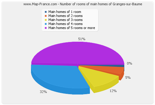 - Number of main homes of Granges-sur-Baume of 1 room : 0 - Number of main homes of Granges-sur-Baume of 2 rooms : 3 - Number of main homes of Granges-sur-Baume of 3 rooms : 7 - Number of main homes of Granges-sur-Baume of 4 rooms : 7 - Number of main homes of Granges-sur-Baume of 5 rooms and more : 29 |