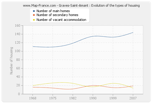 The following graphs show the history of the number and the type of housing of Graves-Saint-Amant from 1968 to 2007. The second graph is drawn in cubic interpolation. This allows to obtain more exactly the number of accommodation of the town of Graves-Saint-Amant years where no inventory was made.