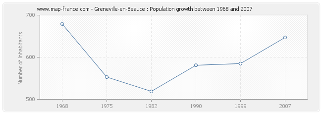 Population of Greneville-en-Beauce was 647 inhabitants in 2007, 585 inhabitants in 1999, 581 inhabitants in 1990, 519 inhabitants in 1982, 553 inhabitants in 1975 and 679 inhabitants in 1968.