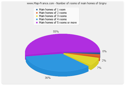 - Number of main homes of Grigny of 1 room : 0 - Number of main homes of Grigny of 2 rooms : 2 - Number of main homes of Grigny of 3 rooms : 9 - Number of main homes of Grigny of 4 rooms : 9 - Number of main homes of Grigny of 5 rooms and more : 66 |