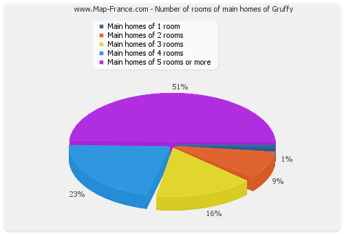 - Number of main homes of Gruffy of 1 room : 4 - Number of main homes of Gruffy of 2 rooms : 47 - Number of main homes of Gruffy of 3 rooms : 84 - Number of main homes of Gruffy of 4 rooms : 84 - Number of main homes of Gruffy of 5 rooms and more : 261 |