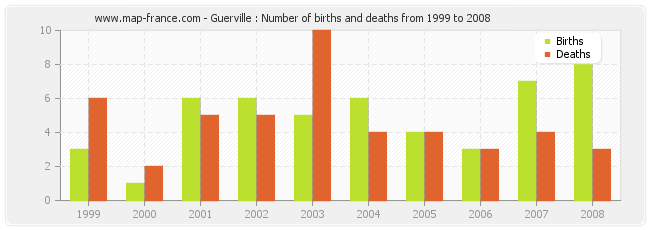 Population of Guerville was 438 inhabitants in 2007, 408 inhabitants in 1999, 443 inhabitants in 1990, 438 inhabitants in 1982, 439 inhabitants in 1975 and 449 inhabitants in 1968.