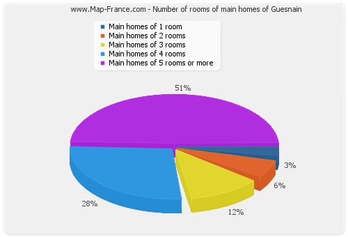 - Number of main homes of Guesnain of 1 room : 57 - Number of main homes of Guesnain of 2 rooms : 109 - Number of main homes of Guesnain of 3 rooms : 225 - Number of main homes of Guesnain of 4 rooms : 225 - Number of main homes of Guesnain of 5 rooms and more : 948 |