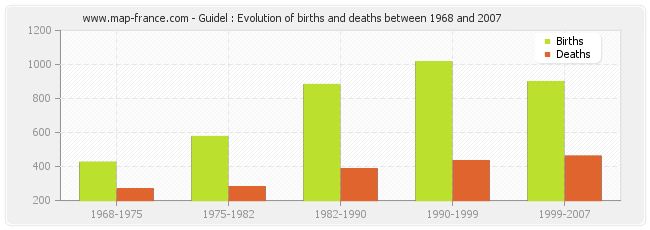 Population of Guidel was 9 973 inhabitants in 2007, 9 155 inhabitants in 1999, 8 241 inhabitants in 1990, 6 071 inhabitants in 1982, 4 163 inhabitants in 1975 and 3 367 inhabitants in 1968.