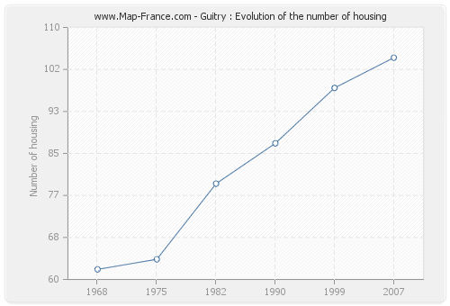 The number of housing of Guitry was 104 in 2007, 98 in 1999, 87 in 1990, 79 in 1982, 64 in 1975 and 62 in 1968.