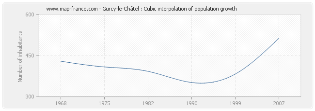 This curve shows the history of the population of Gurcy-le-Châtel from 1968 to 2007 in cubic interpolation. This provides more precisely the population of the municipality of Gurcy-le-Châtel the years where no census has been taken.