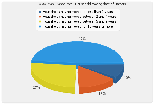 - Number of households of Hamars having moved between 2 and 5 years : 23 - Number of households of Hamars having moved between 5 and 9 years : 43 - Number of households of Hamars having moved for 10 years or more : 79 |