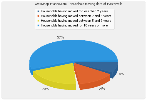 - Number of households of Harcanville having moved between 2 and 5 years : 25 - Number of households of Harcanville having moved between 5 and 9 years : 36 - Number of households of Harcanville having moved for 10 years or more : 102 |
