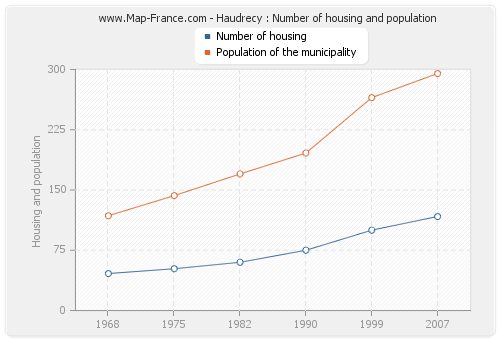 The population of Haudrecy was 295 inhabitants in 2007, 265 inhabitants in 1999, 196 inhabitants in 1990, 170 inhabitants in 1982, 143 inhabitants in 1975 and 118 inhabitants in 1968. Meanwhile, the number of housing of Haudrecy was 117 in 2007, 100 in 1999, 75 in 1990, 60 in 1982, 52 in 1975 and 46 in 1968.
