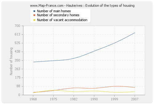 The following graphs show the history of the number and the type of housing of Hauterives from 1968 to 2007. The second graph is drawn in cubic interpolation. This allows to obtain more exactly the number of accommodation of the town of Hauterives years where no inventory was made.
