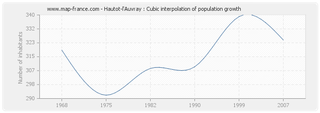 Population of Hautot-l'Auvray was 325 inhabitants in 2007, 339 inhabitants in 1999, 309 inhabitants in 1990, 308 inhabitants in 1982, 292 inhabitants in 1975 and 319 inhabitants in 1968.