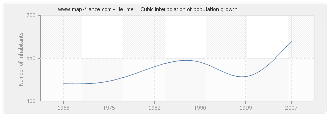 This curve shows the history of the population of Hellimer from 1968 to 2007 in cubic interpolation. This provides more precisely the population of the municipality of Hellimer the years where no census has been taken.