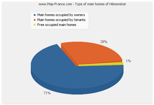- Number of main homes of Hémonstoir occupied by owners : 199 - Number of main homes of Hémonstoir occupied by tenants : 80 - Number of main homes of Hémonstoir occupied free of charge : 2 |