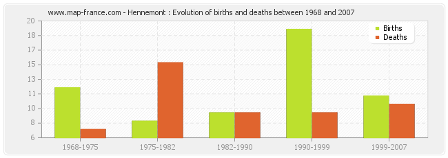 Hennemont : evolution of births and deaths from 1968 to 2007