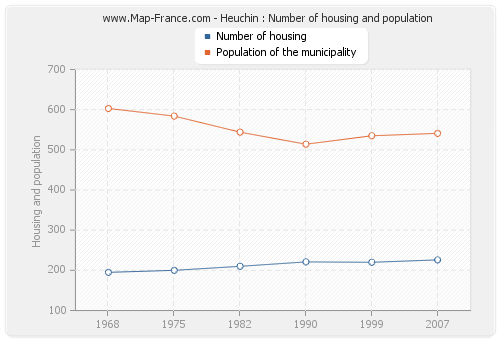 The population of Heuchin was 541 inhabitants in 2007, 535 inhabitants in 1999, 514 inhabitants in 1990, 544 inhabitants in 1982, 584 inhabitants in 1975 and 603 inhabitants in 1968. Meanwhile, the number of housing of Heuchin was 226 in 2007, 220 in 1999, 221 in 1990, 210 in 1982, 200 in 1975 and 195 in 1968.